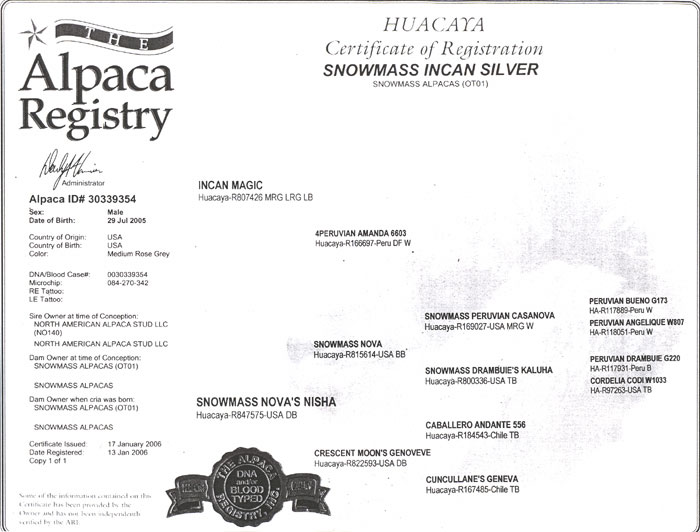 Incan Silver’s well-organized crimp, wonderful fineness and physical style first attracted us. Then we watched him take the blue ribbon at the 2008 Nationals over males that had been winning across the county and knew he would be a great addition to our herd. We had studied the Snowmass grey program for years, and kept coming back to the name Incan Magic, a grey Peruvian with vicunya-type fineness. But 30 years’ breeding experience tells us that in a prospective herdsire, the dam line must be just as strong. When we saw that Incan Silver’s dam is the incredible Nisha, who has a top notch pedigree and sold for $75,000, we knew he had the horsepower to suit our program.