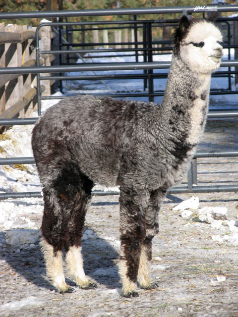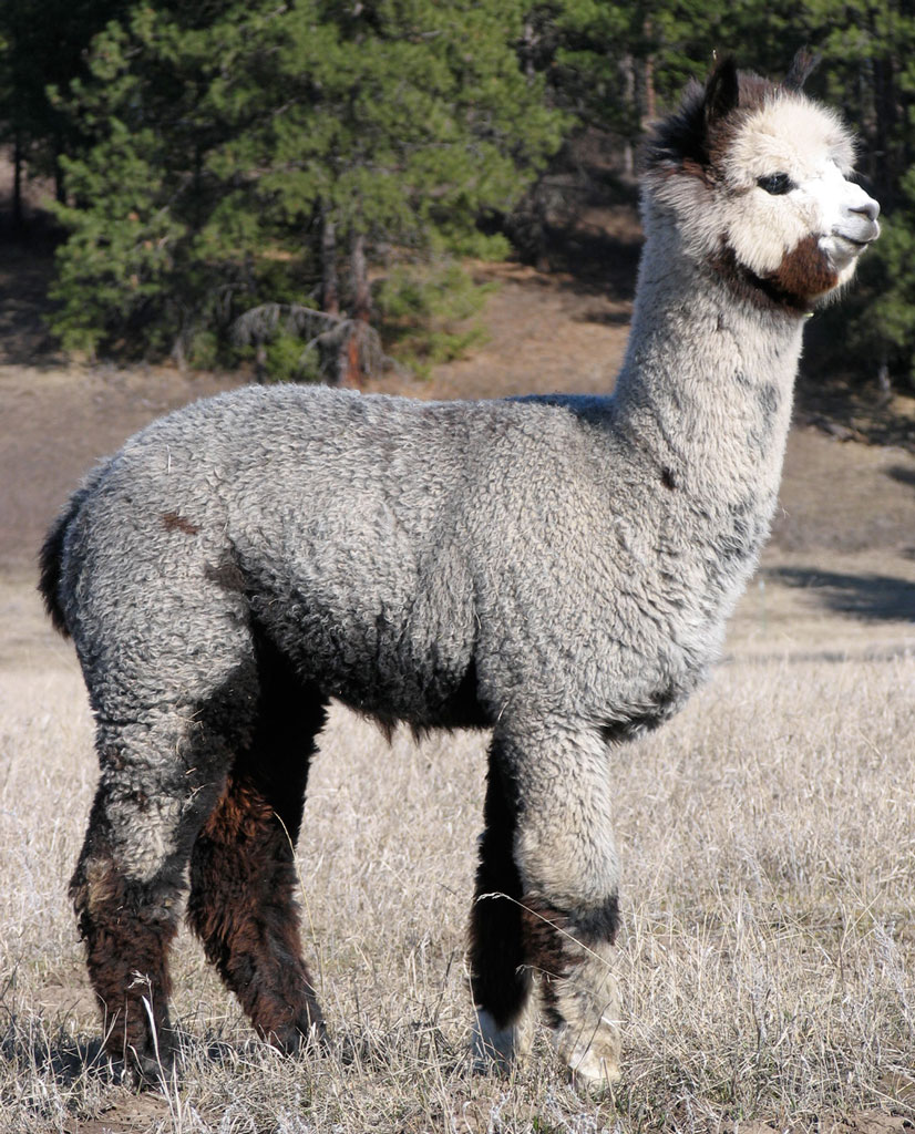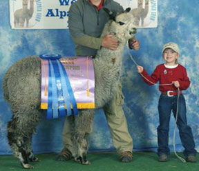 At AWE’s 2002 show and seminar with Mike Safely, Maggie Krieger, Julio Sumar, Alonso Burgos and others, he was lined up with all champions during a presentation on breeding Elite alpacas. The esteemed judges and textile experts pronounced Sterling Silver simply “one of a kind,” the epitome of a grey stud. The evenness of his fineness, his astounding density and uniformity were the best they had ever seen in a grey, and they recommended Sterling Silver as THE stud for the discerning grey breeder.